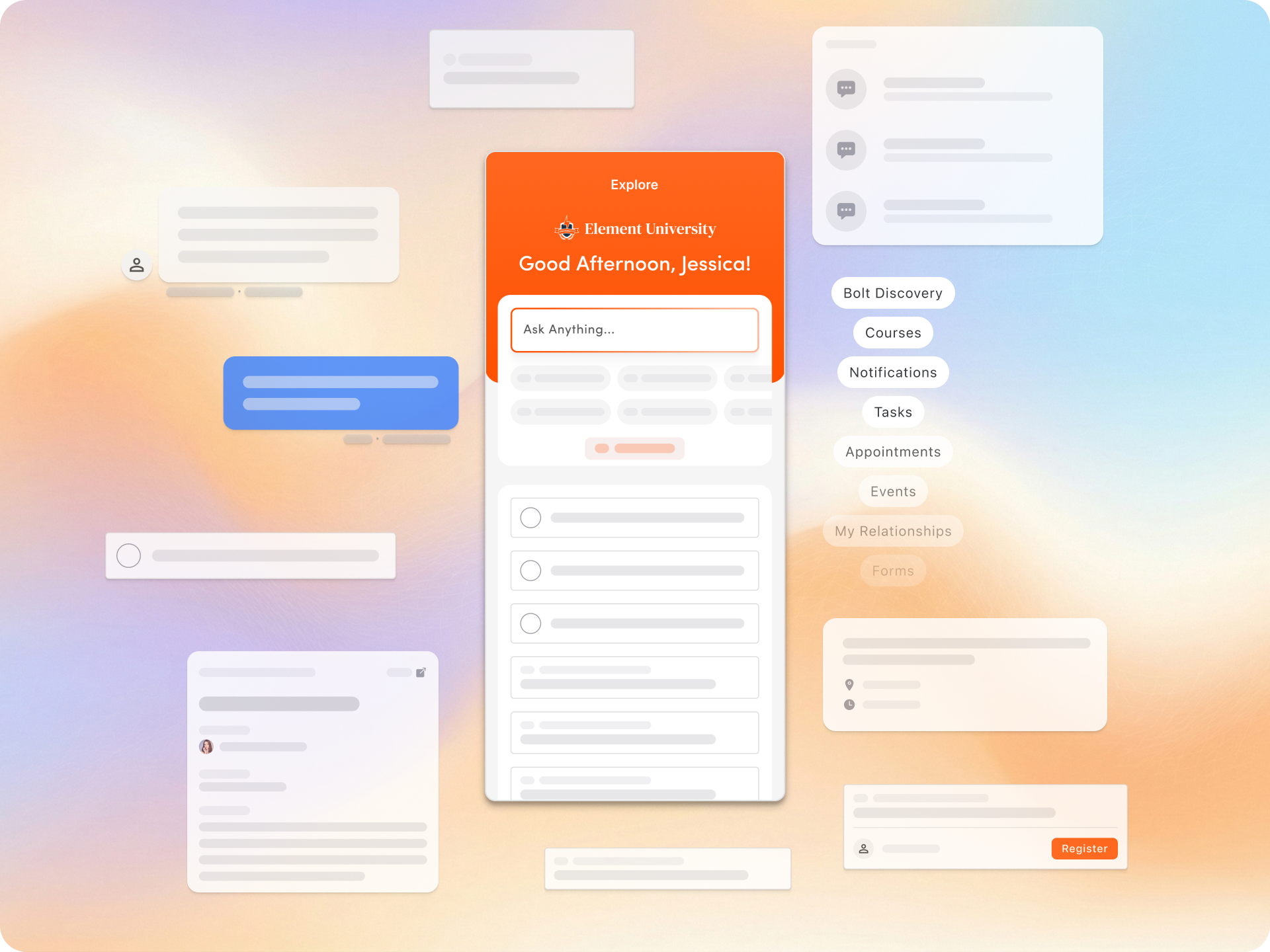 Element451’s Bolt AI Agents engage students, streamline enrollment, and drive student success, working alongside your team in a robust platform designed for higher ed.