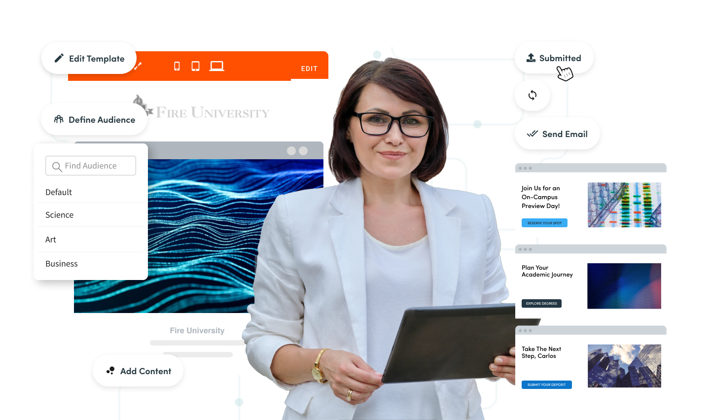 Warm up prospective students with AI-driven content marketing, landing pages, chatbot, and offers that can all be created in a few clicks.