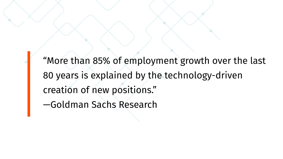 A study by economist David Autor, for example, found that “60% of today’s workers are employed in occupations that didn’t exist in 1940. This implies that more than 85% of employment growth over the last 80 years is explained by the technology-driven creation of new positions.”