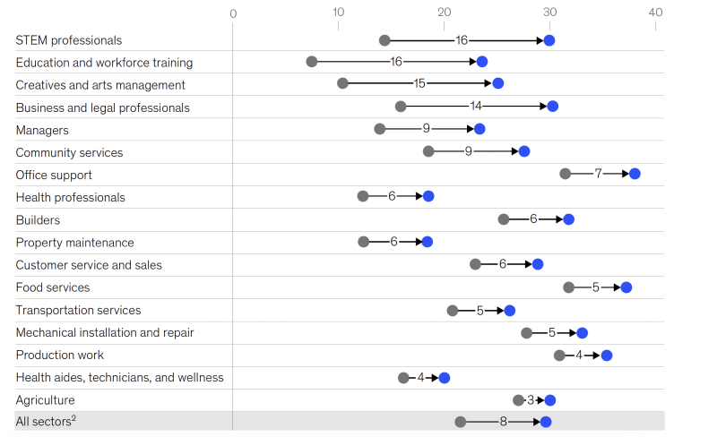 Additionally, “higher levels of educational attainment remain strongly positively correlated with being in less automatable roles,” according to McKinsey.