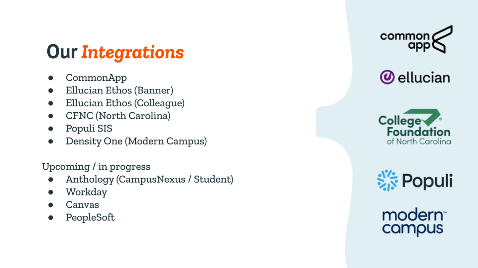 Element451's platform also integrates with and for a wide range of systems. These integrations demonstrate how Element can seamlessly connect with various tools and systems to streamline processes for educational institutions.