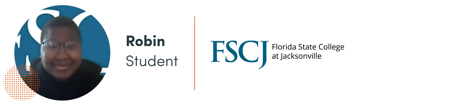 “I got even more deeply involved with my college. I won several awards. I got a job within my college, which I really enjoy. It has solidified the career path I want to take. I want to get my bachelor’s degree in marketing, which I’m pretty sure I want to get at FSCJ. I’m going to get my graduate degree in graphic design. Being at home and seeing how much I can do, and how active I can be: I can be a business owner. I can run things. I can do things I never thought I could do before. I have a newfound respect for what I can do.” More from Robin