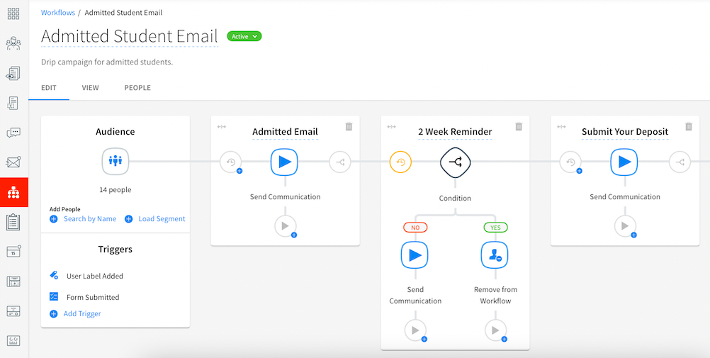 - You can schedule by date and time or, even better, by a trigger. For example, after a student fills out a request for information form, they receive the campaign sequence.