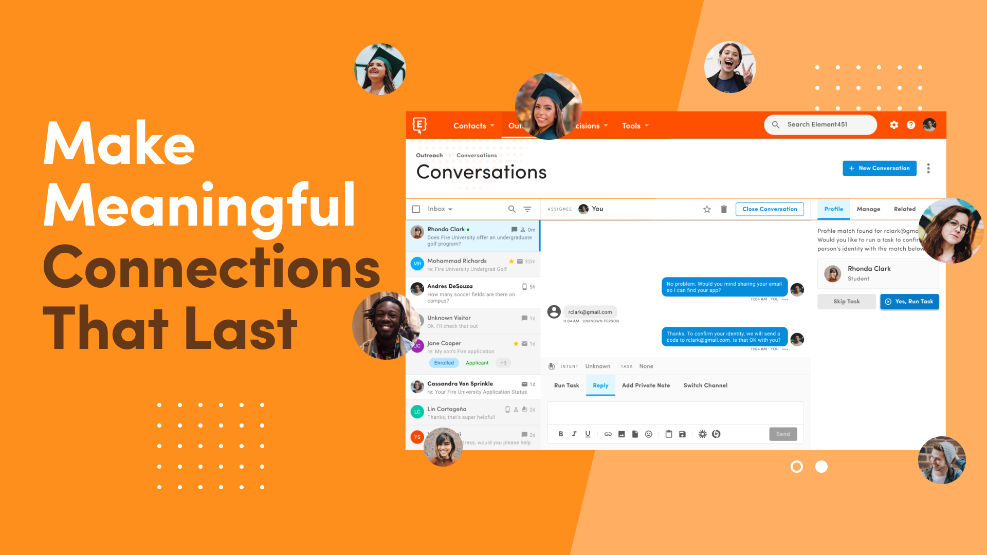 Element451’s revamped Conversations module makes it easier for your enrollment, recruitment and student engagement teams to communicate and connect with students.