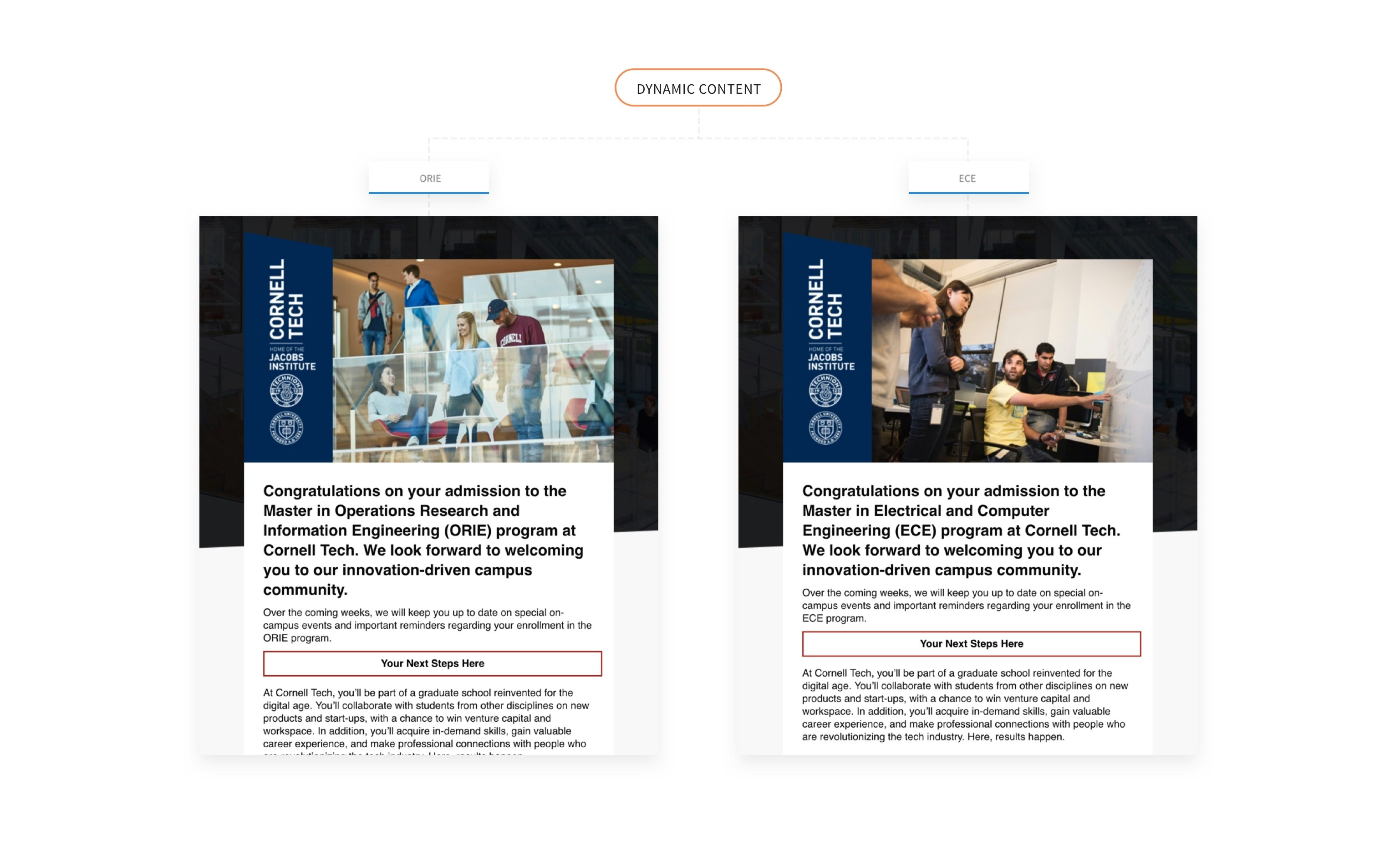 If you imagine all the graduate programs a school like Cornell Tech has and multiply that by three or four personas and then think about the number of emails in a full student search plan, it becomes clear that a manual content creation approach isn’t feasible.