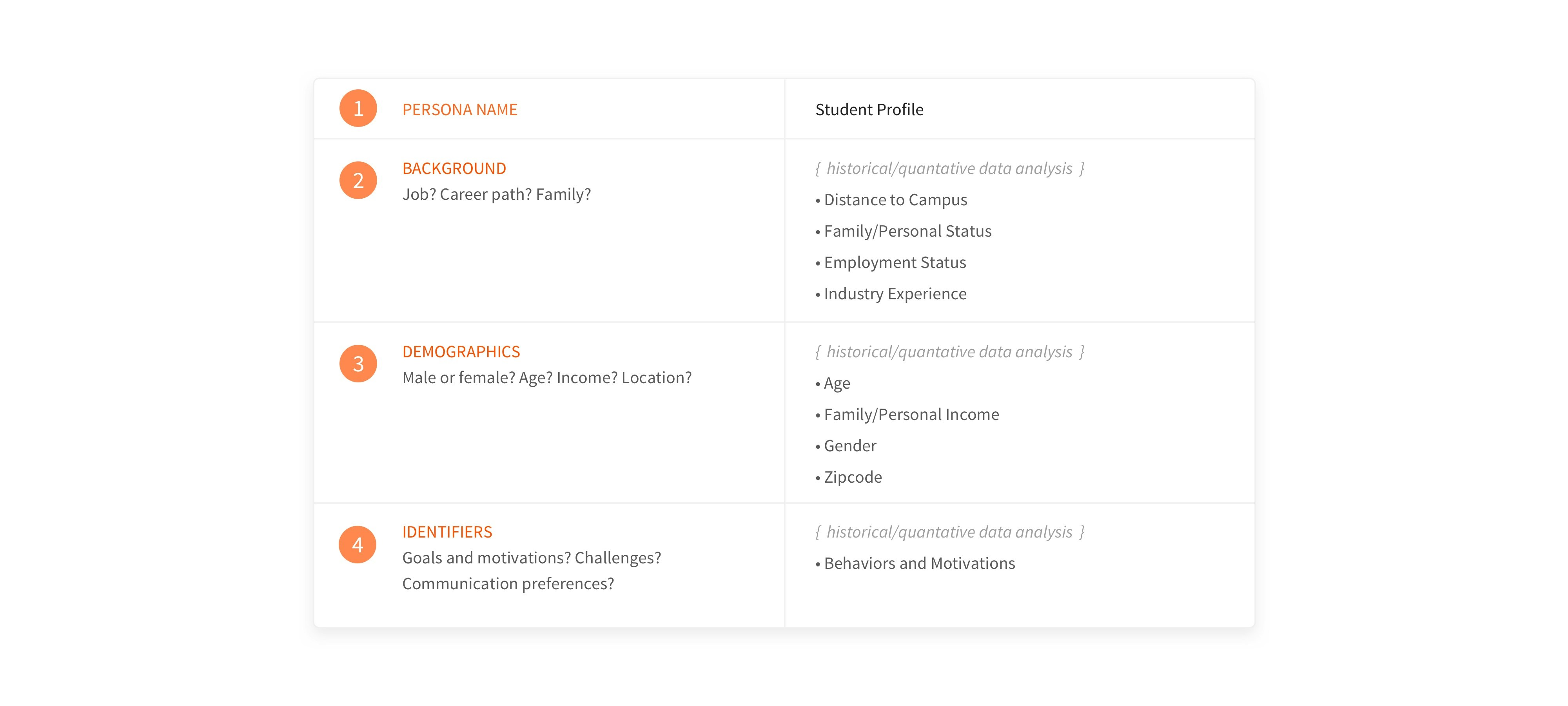 We created personas for general groups of prospective Cornell Tech students, such as the career changer and the recent college graduate.
