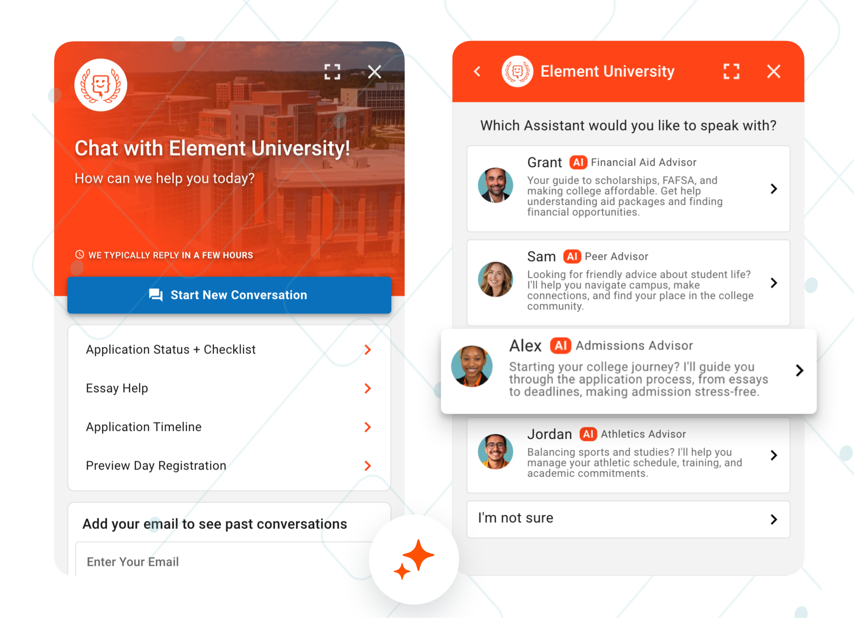 Guides students from application to enrollment - answering questions, celebrating progress, and delivering timely nudges to remove friction, build confidence, and convert admits into enrolled students.