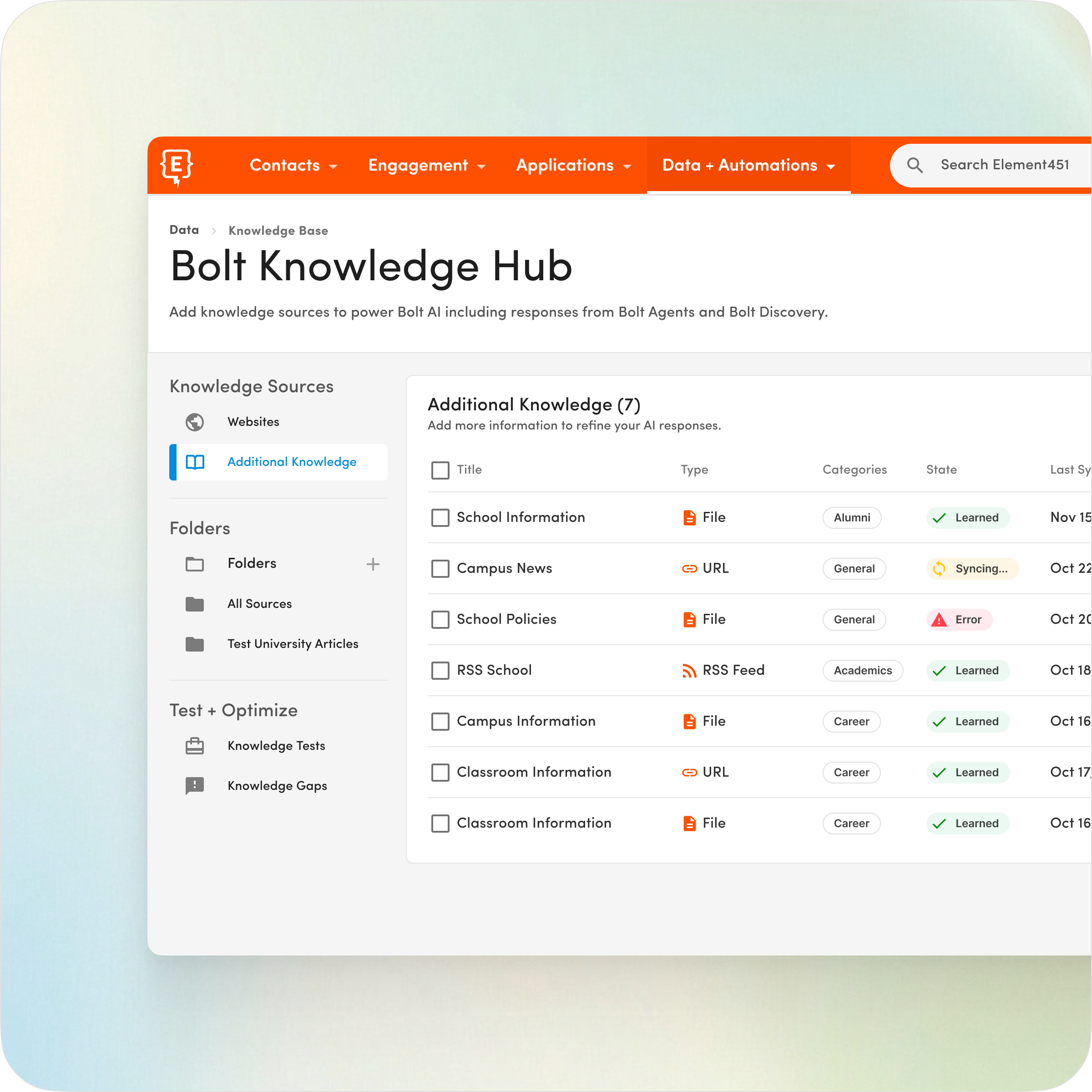 Put your best foot forward to admitted students with Element451. Bolt AI Agents proactively reach out to help students through the enrollment process, keeping them connected and informed throughout the journey.