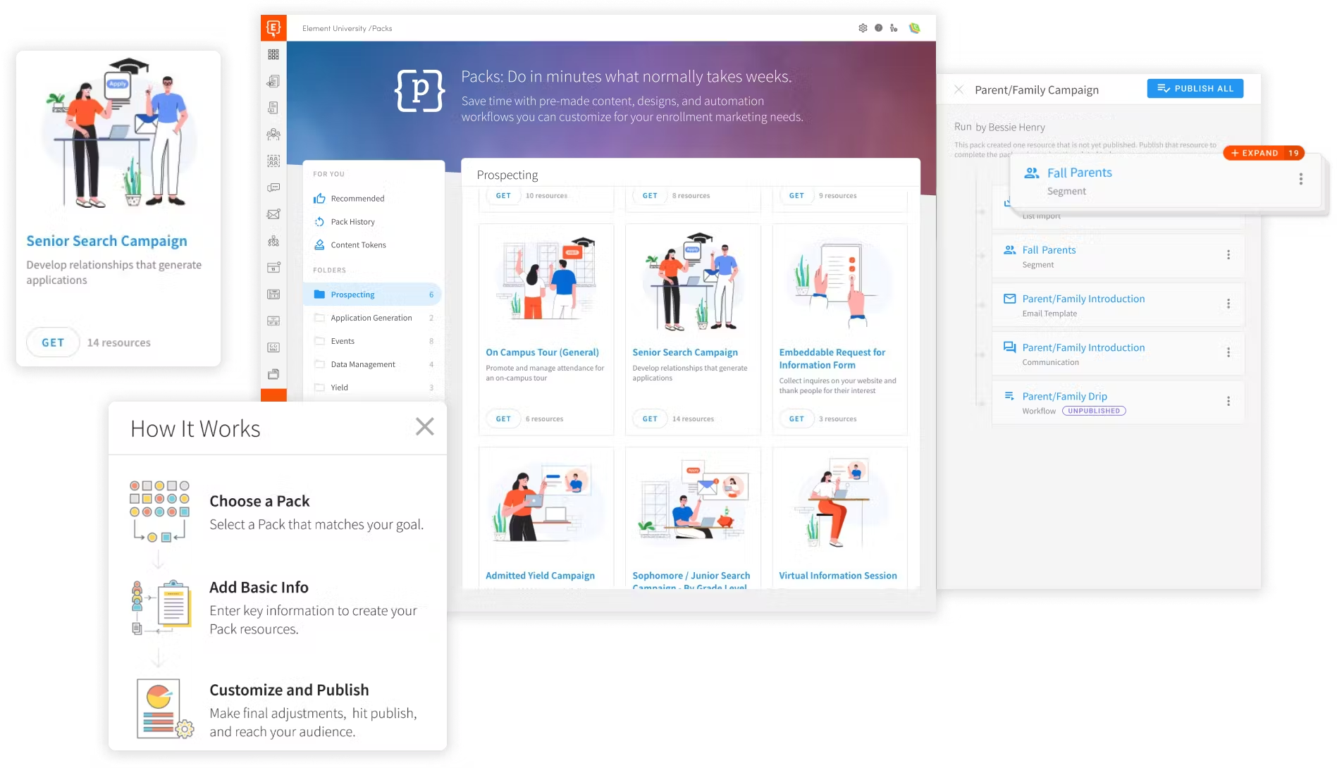 Our exclusive library of higher-ed campaigns actually automates automations. Each Pack comes with the messages for a campaign, such as senior search, and the workflow to run the campaign. Simply install and Packs does the rest.