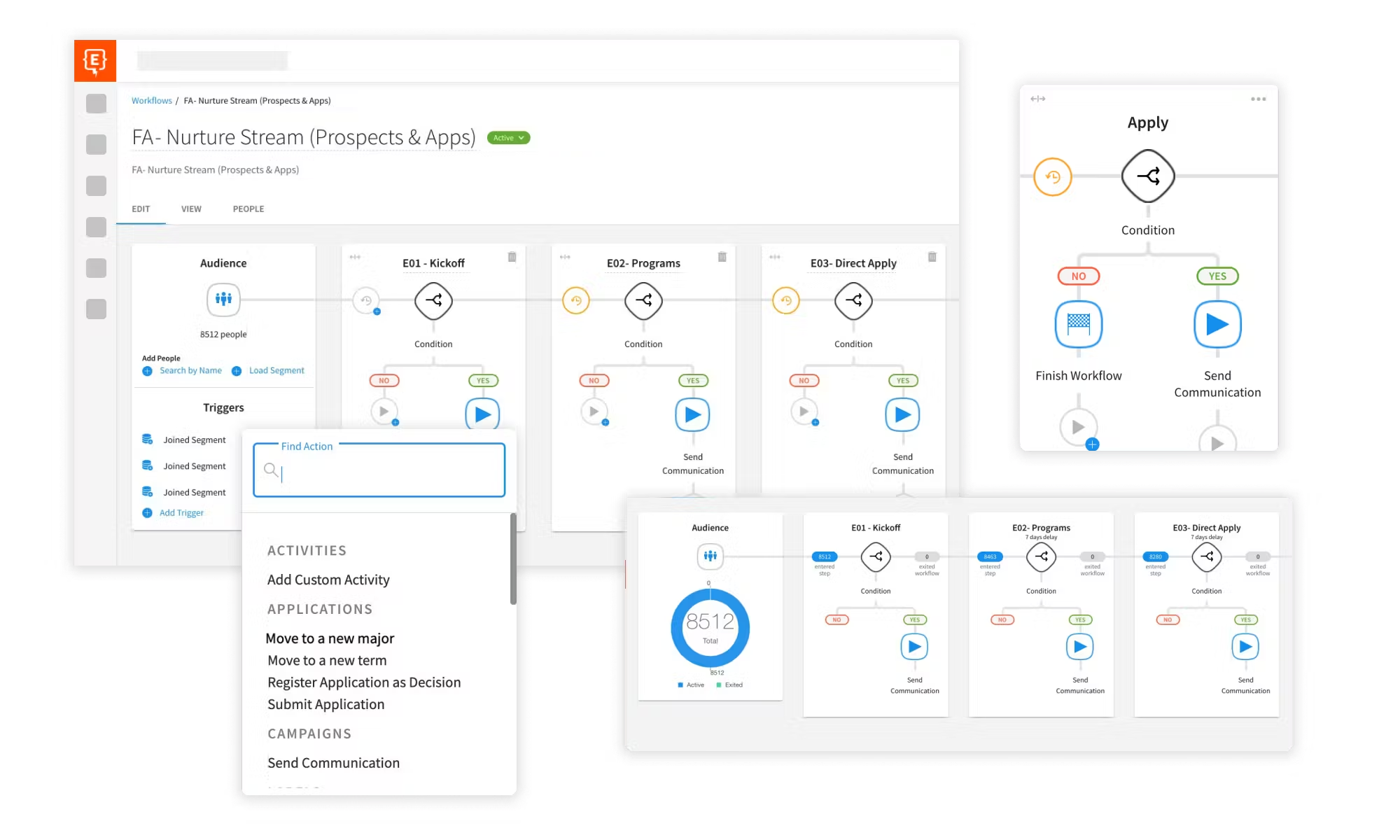 In a few clicks, build a step-by-step series of automated messages. Design workflows that match your campaign’s complexity. Automate actions like submitting a completed application on a student's behalf, creating a perfect circle of productivity.