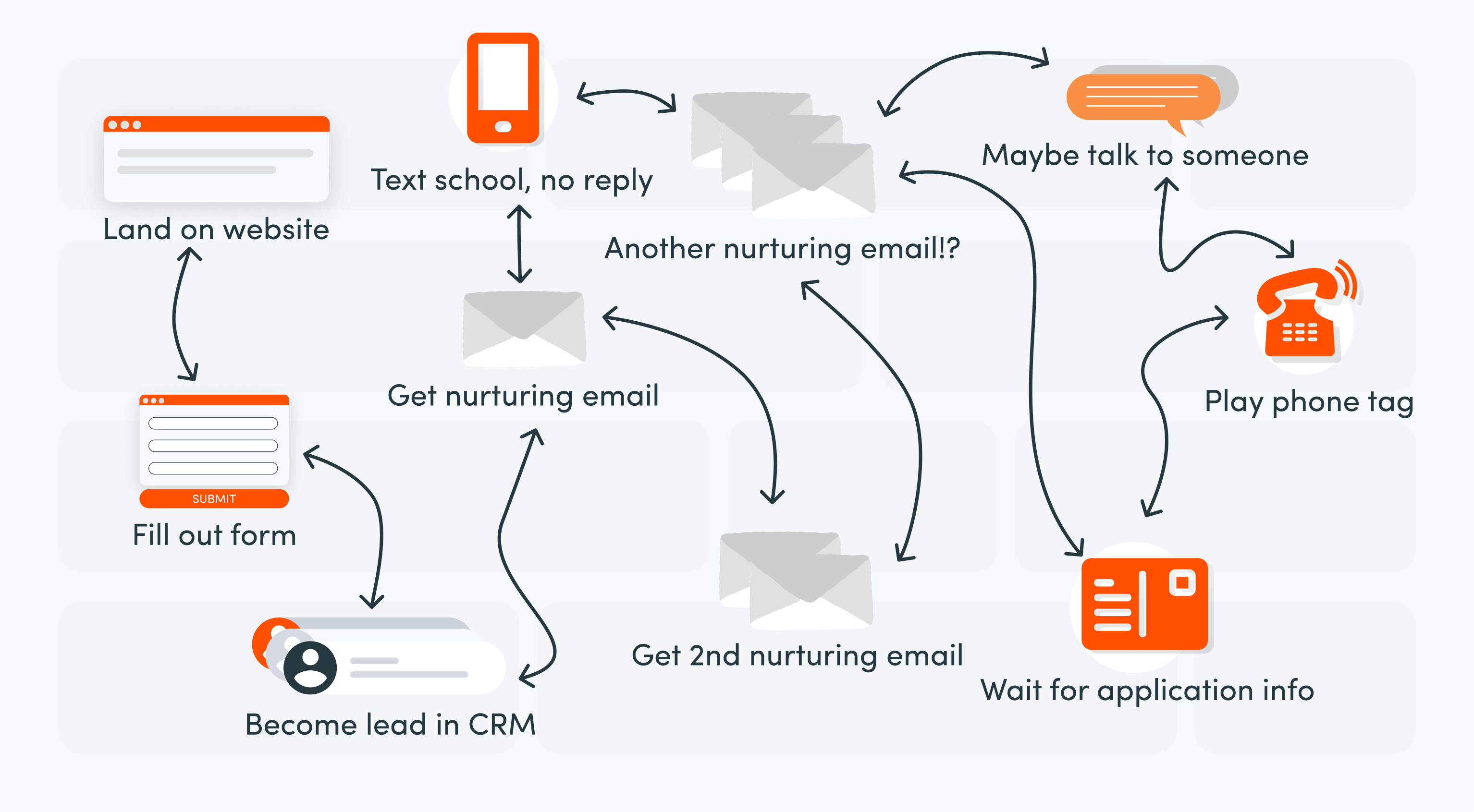 Filling out lengthy forms that take days or weeks to hear back. Playing phone tag back and forth. Dealing with an application process that goes on for weeks (and even months). Students get frustrated when they have to wait. As a result, they might give up on enrolling or end up dropping out of school.✓ Prospects wait days or weeks for a response to a request for information form