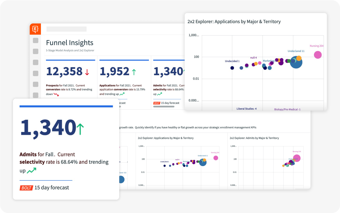 Admission and enrollment teams are busy enough. Disconnected tools and systems like CRMs, SIS, application portals, email platforms, and analytics tools don’t always talk to each other–adding hours of unnecessary time to your plate. Element451’s unified and intelligent platform keeps applications moving forward–and saves hours on repetitive manual work.