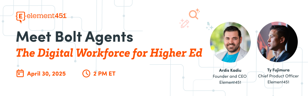 Higher ed teams are stretched thin, balancing recruitment, student success, and campus operations with limited time and resources. What if AI could work alongside your team—anticipating needs, taking action, and reducing workload? With Bolt Agents, Element451’s AI-powered assistants and advisors go beyond automation to become true teammates—helping i...