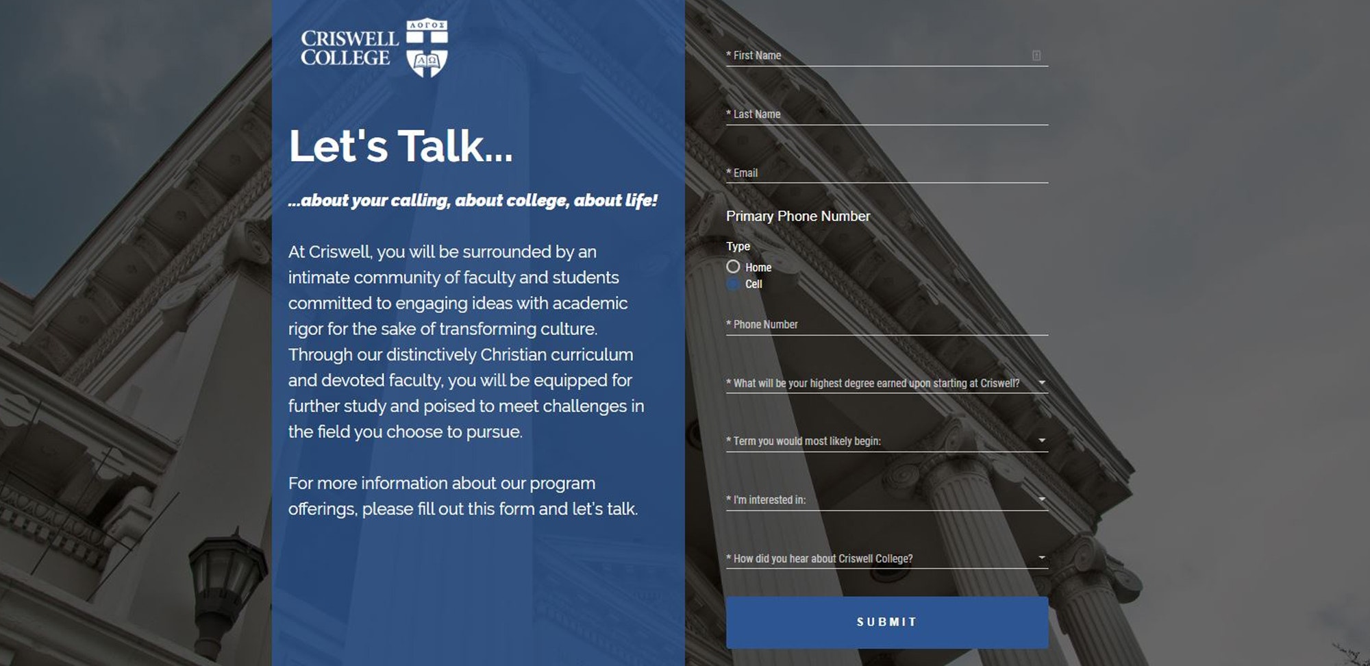 With a student-faculty ratio of 12:1, Criswell College prides itself on personal relationships with students. Fitzwater was determined to find an admissions CRM that aligned with those values. “When we started searching for software, I wanted something that would do the hard part so we could focus on building relationships.”