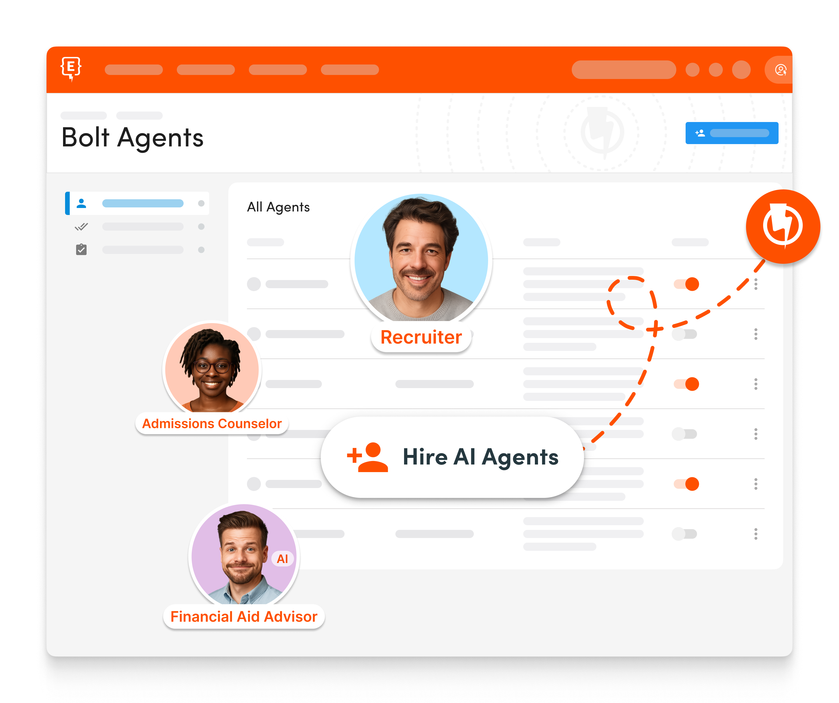 Onboard Bolt Agents—for Admissions, Marketing, Engagement, and Student Success. Our AI agents come ready to work, built for higher ed, and focused on results.