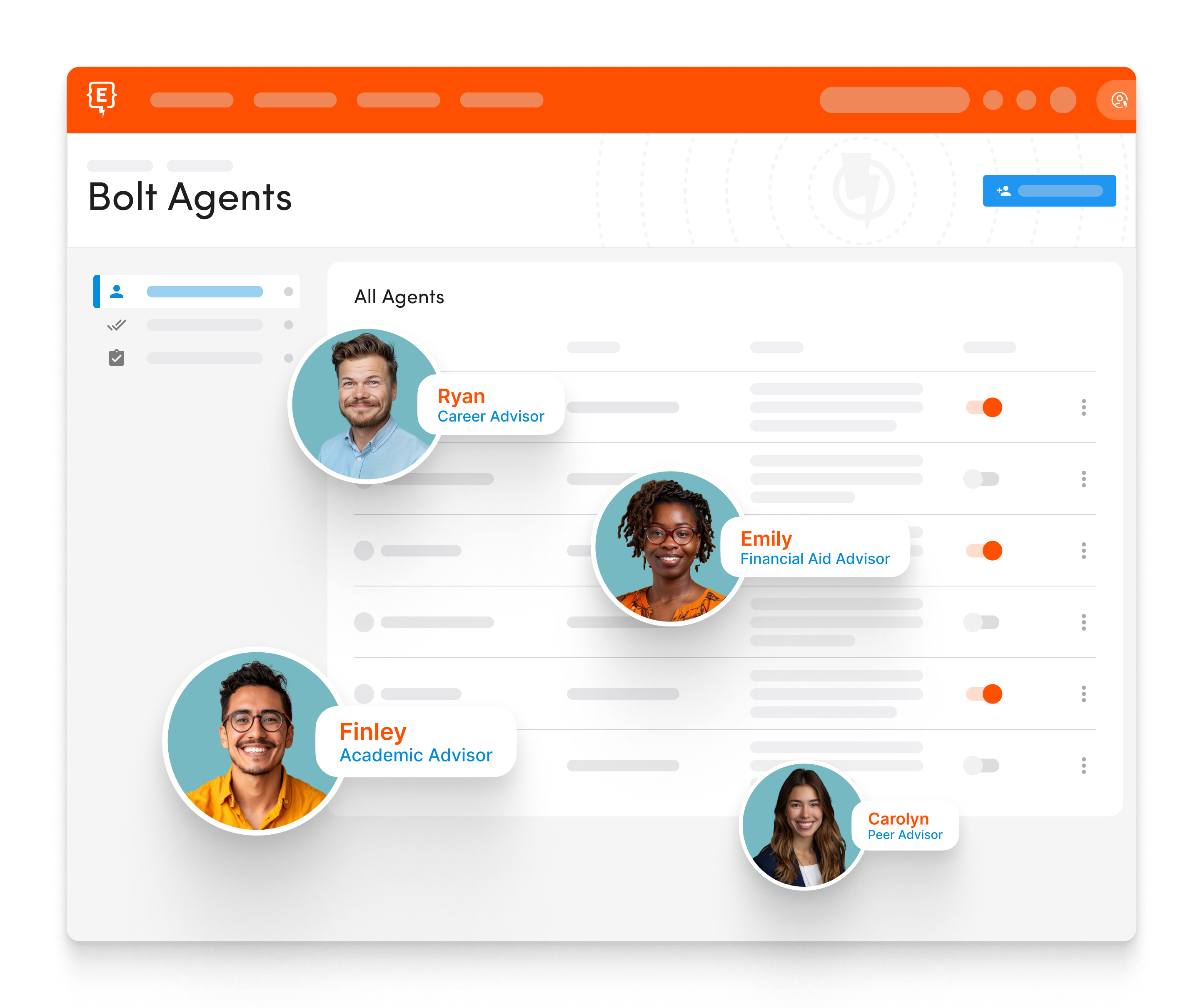 Explore below how Bolt Agents can work for you. Guiding, supporting, and engaging students across their journey—ensuring persistence, retention, and driving success through graduation.